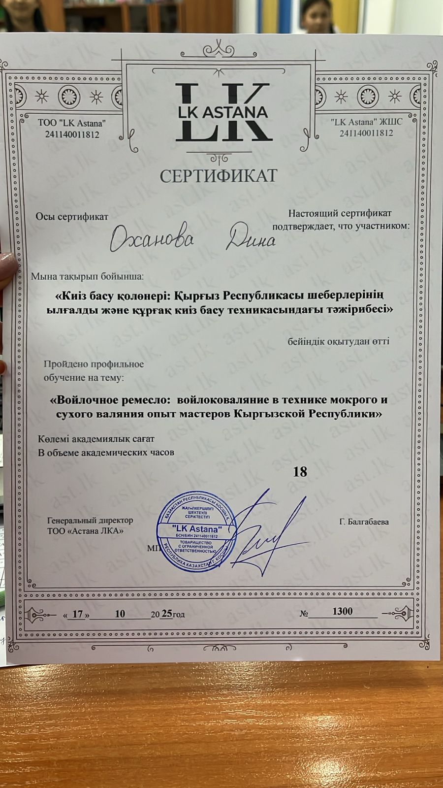 Халықаралық Қырғыз Республикасы шеберлерінің ұйымдастыруымен “ Киіз басу қолөнері , ылғалды және құрғақ киіз басу техникасы” атты шебер сабаққа мектебіміздің көркем еңбек пәні мұғалімі Оханова Дина Тазабековна қатысып, сертификат алды. 🎉🎉🎉 Құттықтаймыз!!!