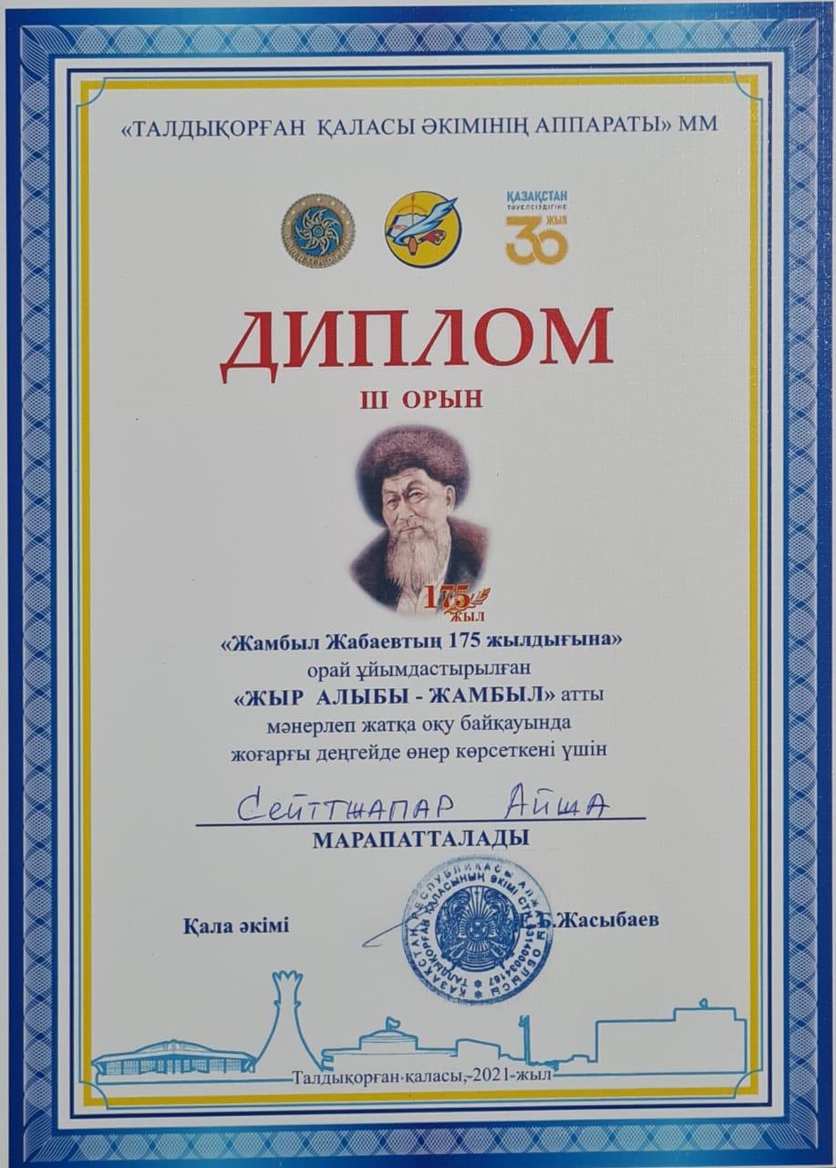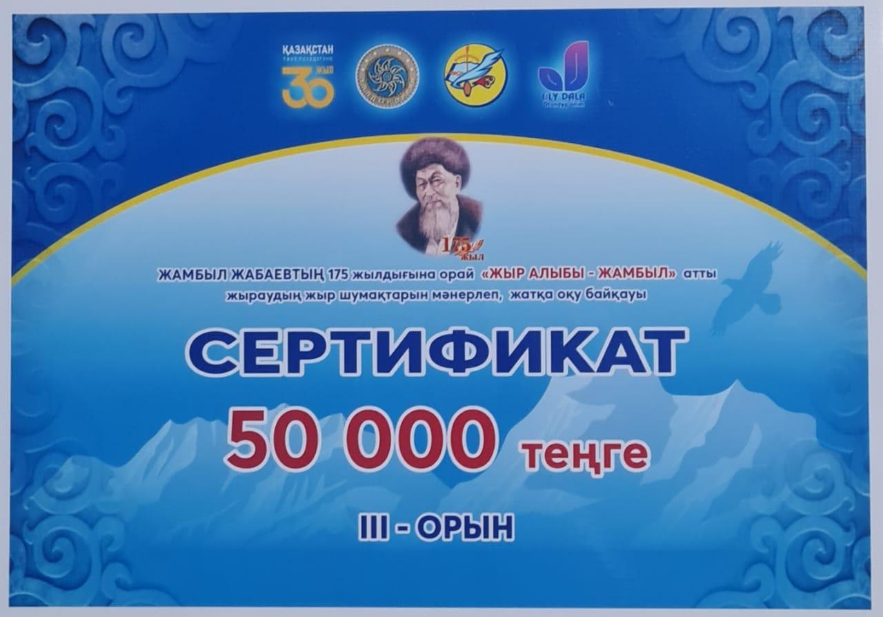 2021 жылғы 15 наурыз күні Талдықорған қаласы әкімдігінің қолдауымен Талдықорған қаласының мәдениет және тілдерді дамыту бөлімінің ұйымдастыруымен «Ұлы дала» отандық компаниясының демеушілігімен Жамбыл Жабаевтың 175 жылдығына орай «Жыр алыбы-Жамбыл» атты жыраудың жыр шумақтарын мәнерлеп, жатқа оқу байқауы өтті.